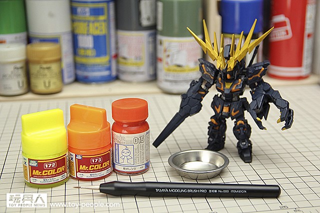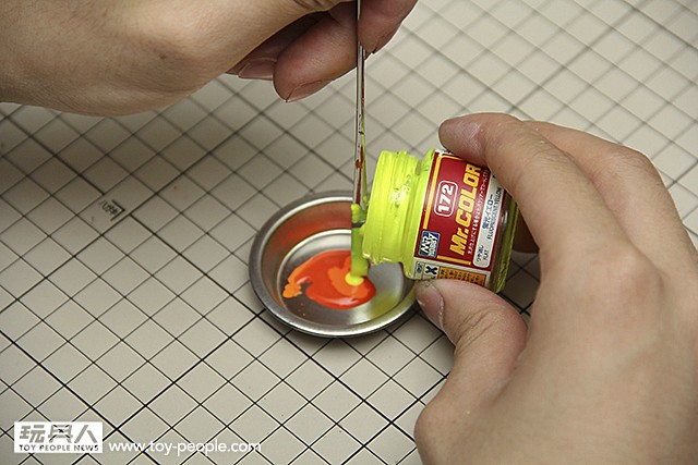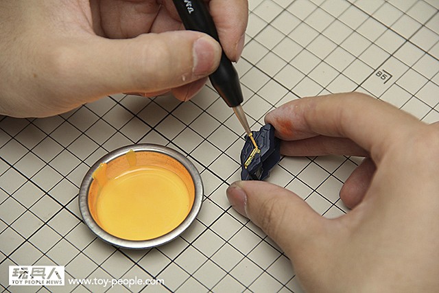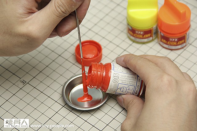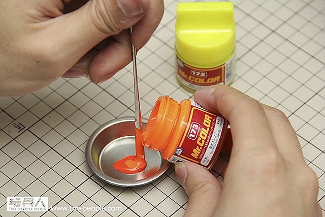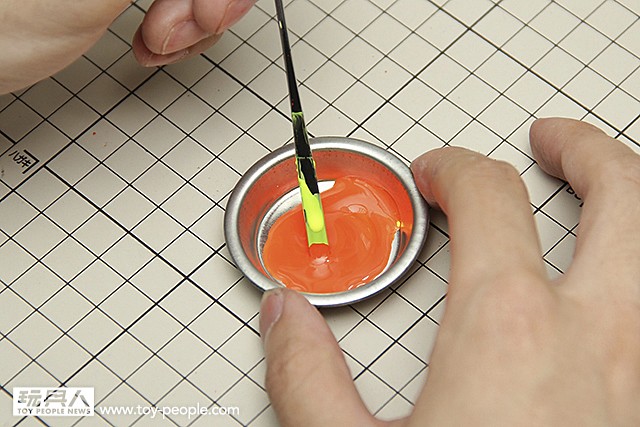 ▼ 由於螢光顏料再塗裝上容易透光,不易上色,所以先使用橘色顏料打底。