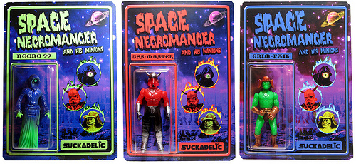 在Suckadelic網站上公佈他們最新的玩具吊卡The Space Necromancer & His Minions太空惡靈法師和他的手下。suckadelic在自己的網站上總是販售他們自行開發的玩具商品,有點以獨立製作發行suckadelic認為有趣的玩具,數量都相當稀少。這次的Space Necromancer系列以三個為一組的形式販售,高約3"限量50組售價約200元美金。
