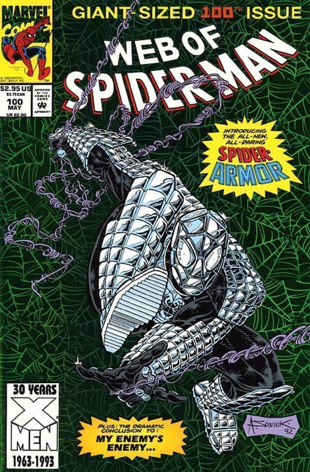 ARMORED SPIDER-MAN 根據網路資料第一次出現是在Web of Spider-Man #100,主要宇宙是earth-616。彼得帕克設計出的衣服,他會讓蜘蛛人的速度每有平時這麼快速甚至會減緩速度,但是優點就是可以防彈。