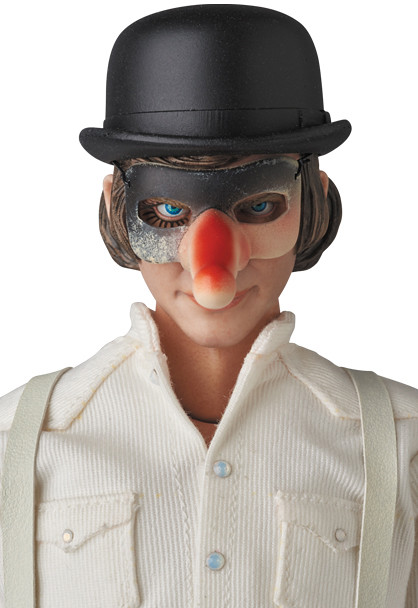 這次所推出的「艾力克斯」作品在頭雕的部分可說是把其在電影中的神情完整還原。此外,在服裝的部分,袖口有眼球造型的白襯衫、經典裝著牛奶的玻璃杯、拐杖刀、"造型"獨特的面具都一一附上啊!!這個經典的角色,以1/6 比例的方式來還原,絕對是史丹利.庫柏力克影迷必需珍藏的一個作品啊。