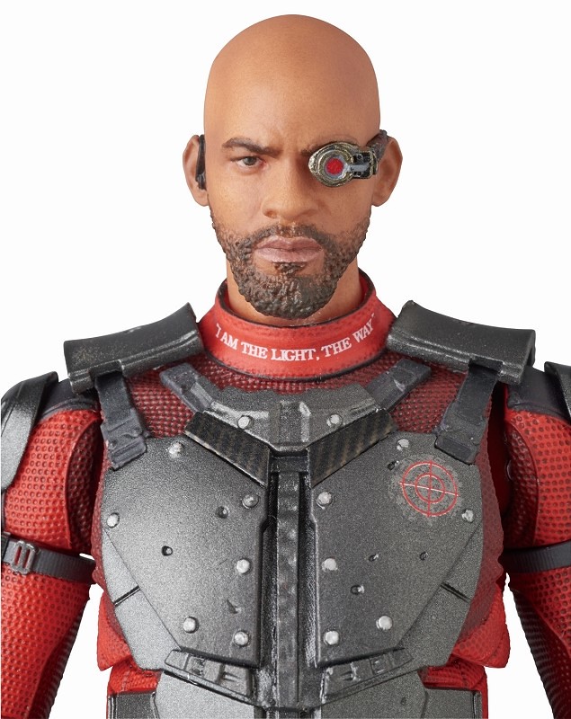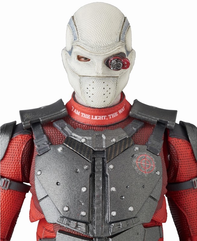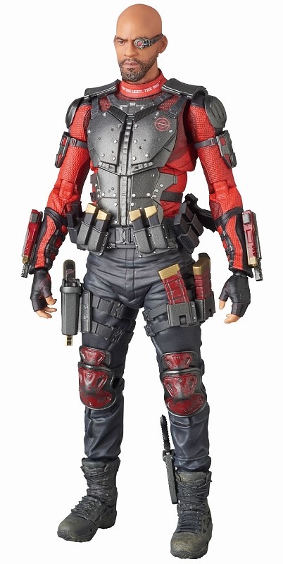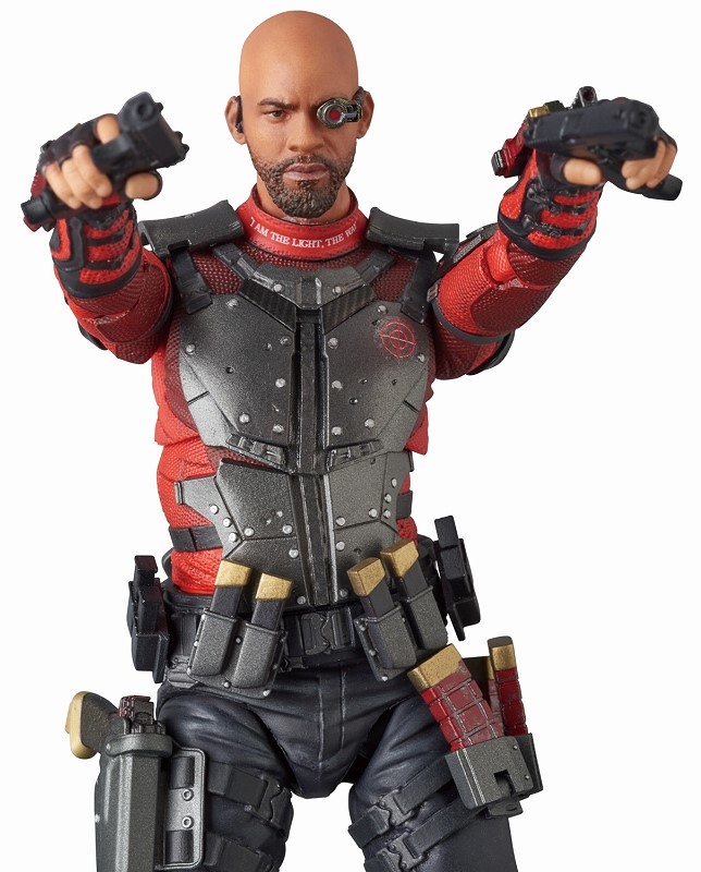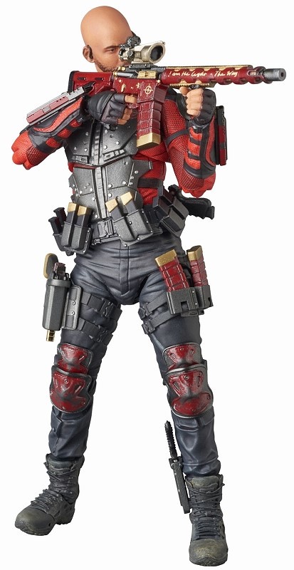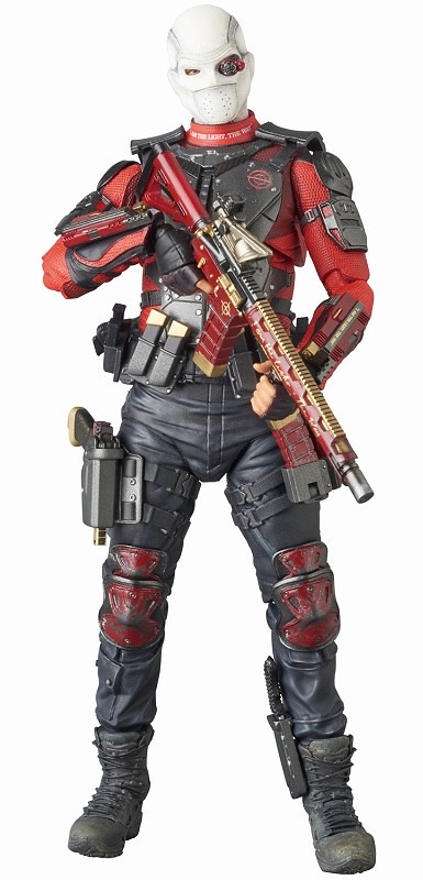 這次MAFEX 的作品,忠實地還原了在電影「自殺突擊隊」中登場由威爾.史密斯所飾演的「死射」造情,附上了冷酷未戴著白色面具以及戴上白色面具兩種造型的頭雕;在武器配件的部分除了全身充滿了彈夾之外,步槍、手槍、小刀一樣經典的武器都沒有少,透過精湛的上色與雕刻技巧來打造出其複雜的衣服裝束,有興趣的玩具人不要錯過囉。