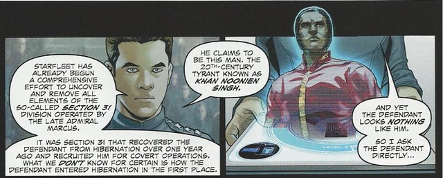 可汗在2259年遭受星聯議會的審問,但寇克調出自己查的資料,聲稱現在可汗的長相跟20世紀不一樣,懷疑是不同人,希望可汗要解釋清楚自己的真面目到底是什麼,於是可汗講述了他的起源。(這張圖的長類類似原始版的可汗,至於為何會變成新版這樣,就請各位看下去)