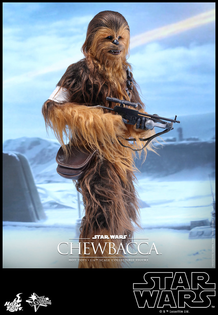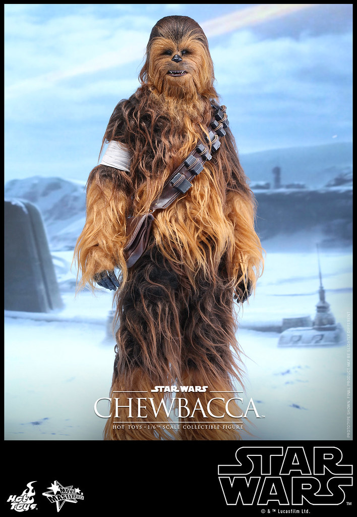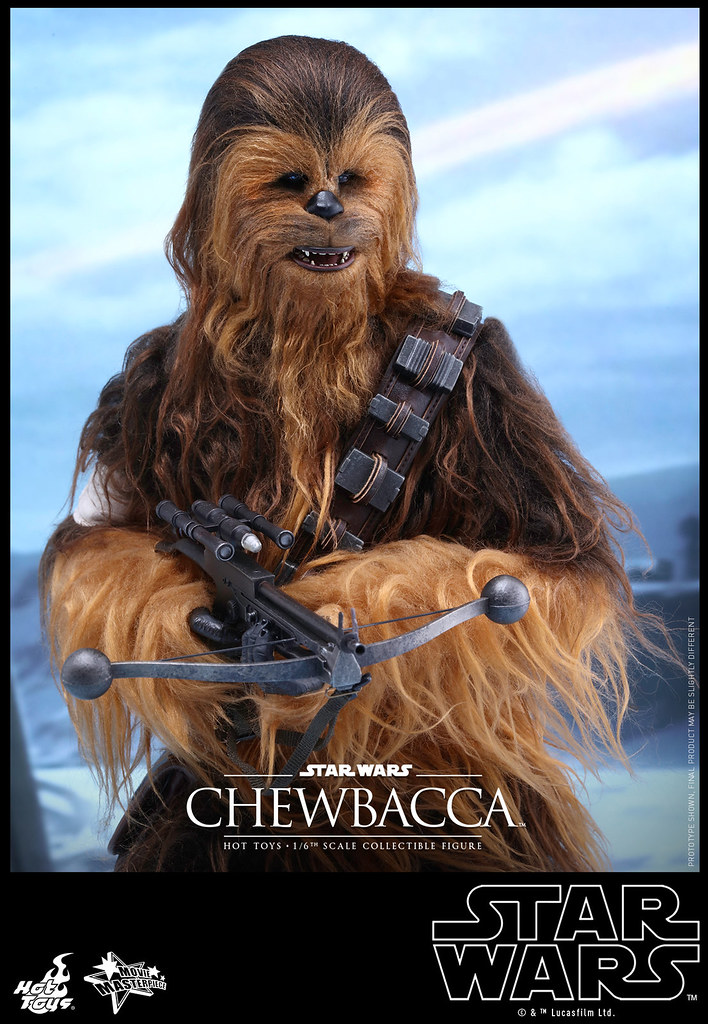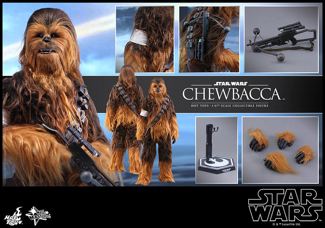 Hot Toys 公司繼推出了電影「STAR WARS:原力覺醒」(Star Wars: The Force Awakens)中「韓索羅」(Han Solo)的1/6 比例人偶作品之後,又將要推出其最忠實的搭檔:「丘巴卡」(Chewbacca)。與之前星際大戰四部曲:曙光乍現的質感相同,Hot Toys 公司完全將武技族戰士的造型表現出來,特別是在丘巴卡身上的毛髮顏色跟質感更是逼真到不行啊。