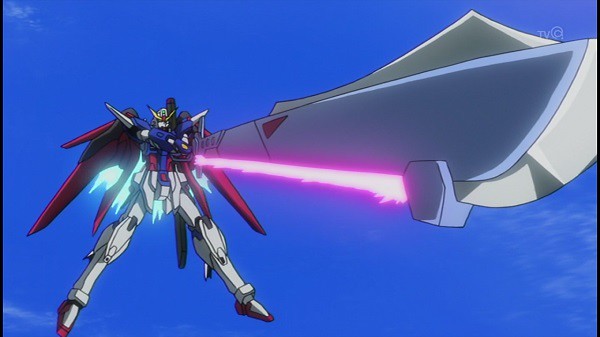 ▲ MG命運鋼彈,配備一柄MMI-714「亞隆戴特」光束巨劍,為「石中劍」鐳射對艦刀的改良型,刀身更長,因為太長了,不使用時要折疊起來才能收納在背包上的武器掛架。