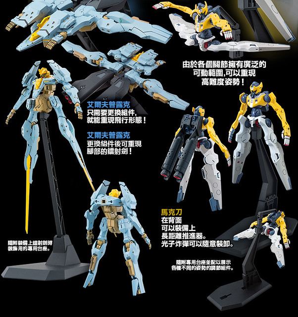 ▲ HG艾爾夫普露克和HG馬克刀,可變形機體,腳底裝備了巨大光劍,在空中一邊飛行、一邊踢出腳刀的戰鬥方式非常特別。