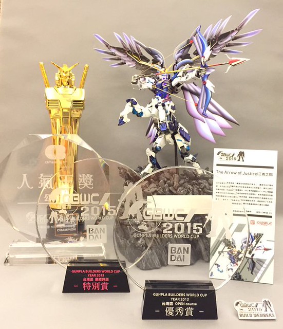 《2015鋼彈模型製作家全球盃》台灣公開組冠軍,作品名:正義之箭,作者:周毅明,人馬拉弓射箭的姿勢,沒有第二句話就是帥。