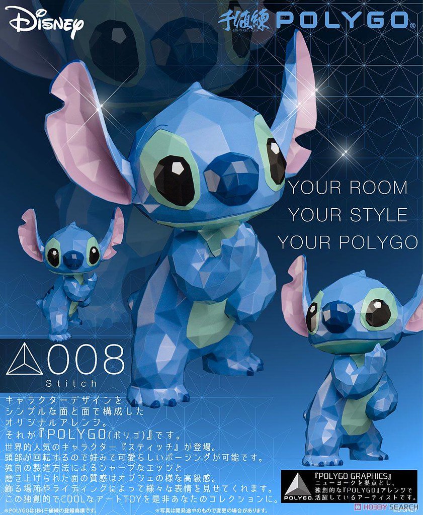 日本知名玩具品牌“千值練”與造型工作室POLYGO GRAPHICS合作,推出以多邊型構成的「POLYGO」角色系列,首款作品已經推出「米老鼠」Mickey Mouse頗受喜愛米奇的玩具人們的歡迎,這次將繼續以迪士尼動畫《星際寶貝》當中的史迪奇STITCH為主題推出這個多邊型系列,因應其造型的緣故只設計了頸部可以轉動的關節,喜愛《星際寶貝》動畫的玩具人可以參考一下歐!