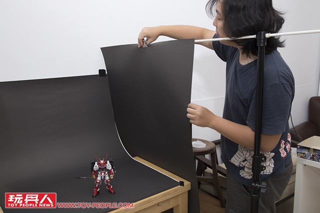 ▼ 首先要先確認鋼彈放置在攝影棚那個位置,然後將它固定好。由於鋼彈模型較輕,建議可以去文具店購買魔術粘土來幫助穩定性