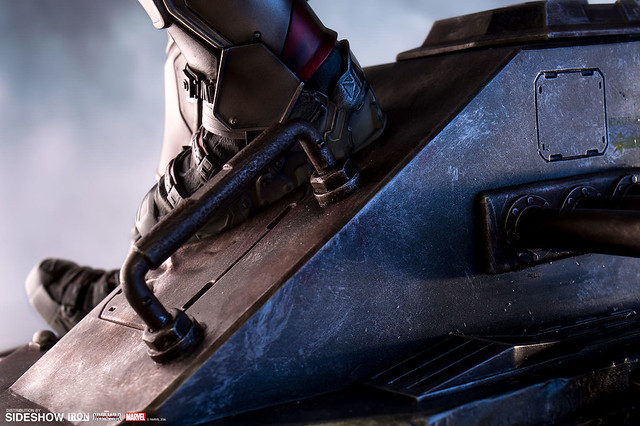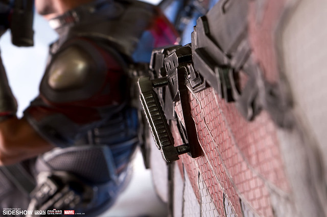 相比之前所推出1/10 比例的獵鷹雕像來說,這次Iron Studios 品牌所推出1/4 比例的「獵鷹」全身雕像作品可說是更完美呢!以打開雙翼的形式登場,雙手拿著Submachine Gun 武器的戰鬥畫面作為整體作品的設定;特別是在獵鷹飛行裝備的構造部分可說是雕刻的相當精細啊。此外,這次的作品有多附上右手臂的替換造型配件,而整體作品同樣是採用Polystone 與真實布料來打造出複合材質的雕像,而在手工塗裝也非常的高水準,將金屬質感的表現以及地台舊化都製作的非常棒啊!
