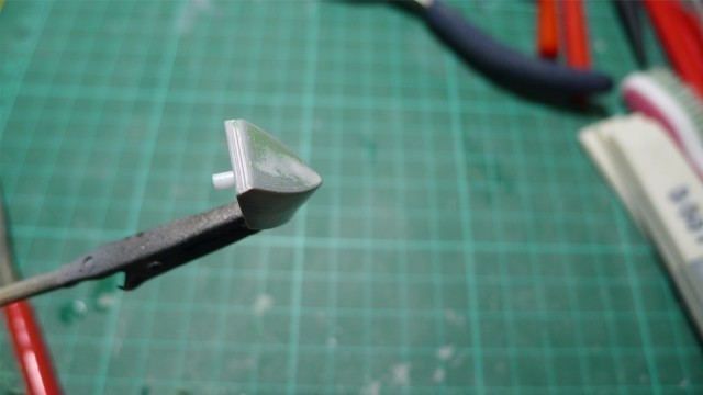 當然,如果想要有光滑的表面效果,仍然是需要上補土打磨的,像是這款模型的面罩以及頭部的裝飾零件,我採用了保美牌補土以及MK-21的綠補土來修補表面的紋路。我個人很愛用保美牌補土,因為它的流動性很好,是修補FDM成品的好幫手。