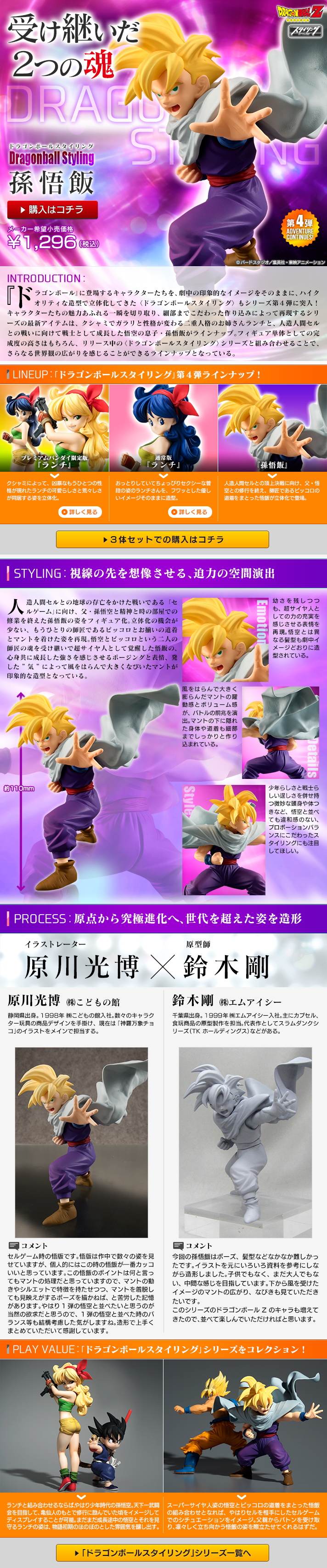 大受好評的《七龍珠》DRAGONBALL STYLING盒玩系列,這次第四彈將推出人氣角色「孫悟飯」來呈現並且以《七龍珠Z》ドラゴンボールZ 動畫中所登場的服裝造型來製作,在劇中“比克”訓練他後進行跟不少強敵們戰鬥,當時造型上有個像是比克披肩的模樣,這次也完整呈現出那個有著大披肩樣貌,預計於魂web線上商店在2016年7月8日開始接受訂購,喜愛鳥山明老師經典的作品《七龍珠》系列的玩具人可以參考一下歐!