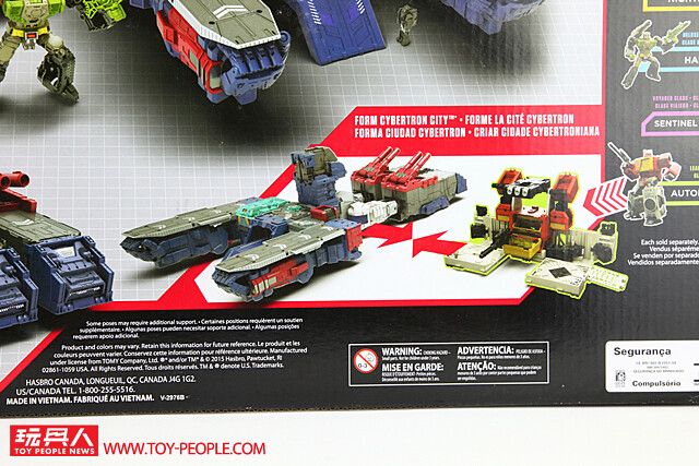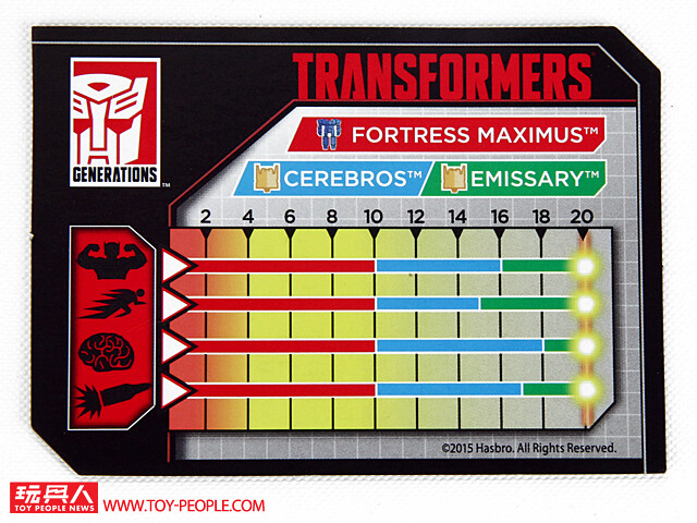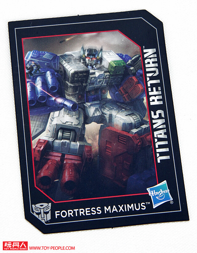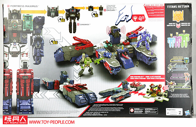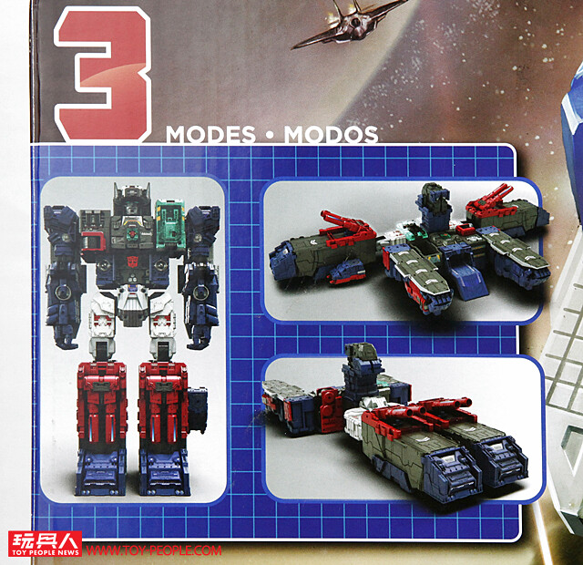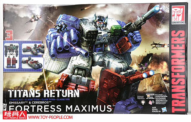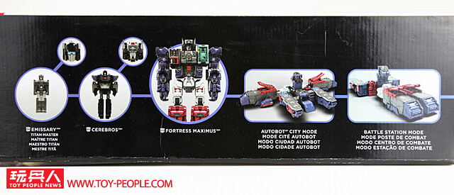 ▼ 包裝上方,除了介紹三種不同型態以外,還介紹了機人型態的三位成員:“福特基地”(Fortress Maximus)、超級頭領金剛戰士“賽羅伯斯”(Cerebros)與賽羅伯斯的頭領金剛戰士“密使”(Emissary)。