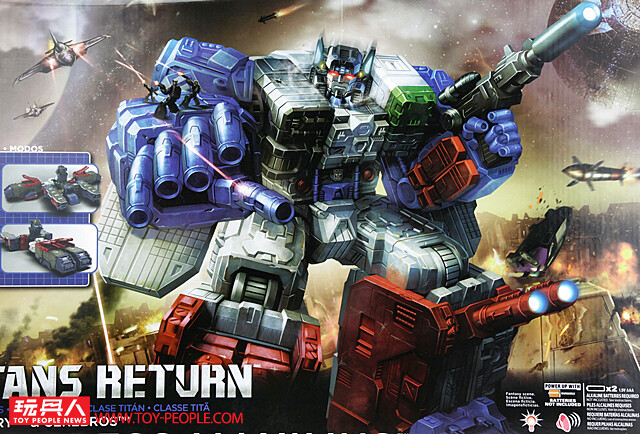 ▼ 包裝側面採用了《泰坦之戰》系列一貫的設計插畫,繪製的是頭領金剛戰士與變形金剛合體的場景。