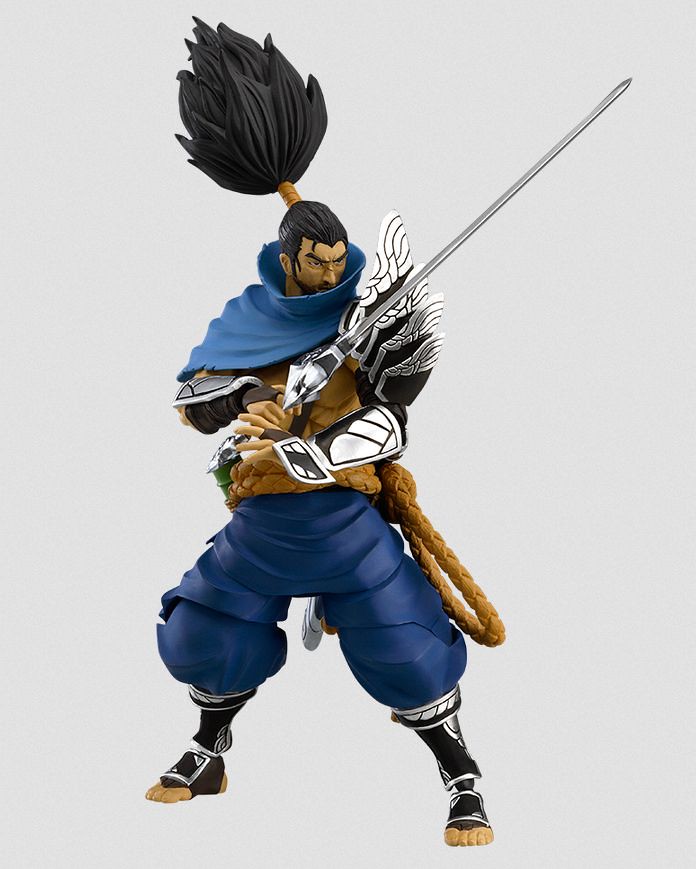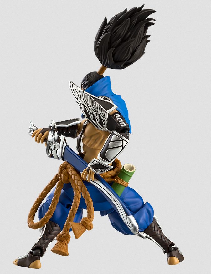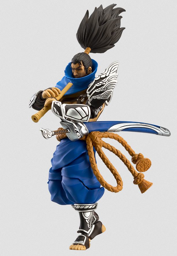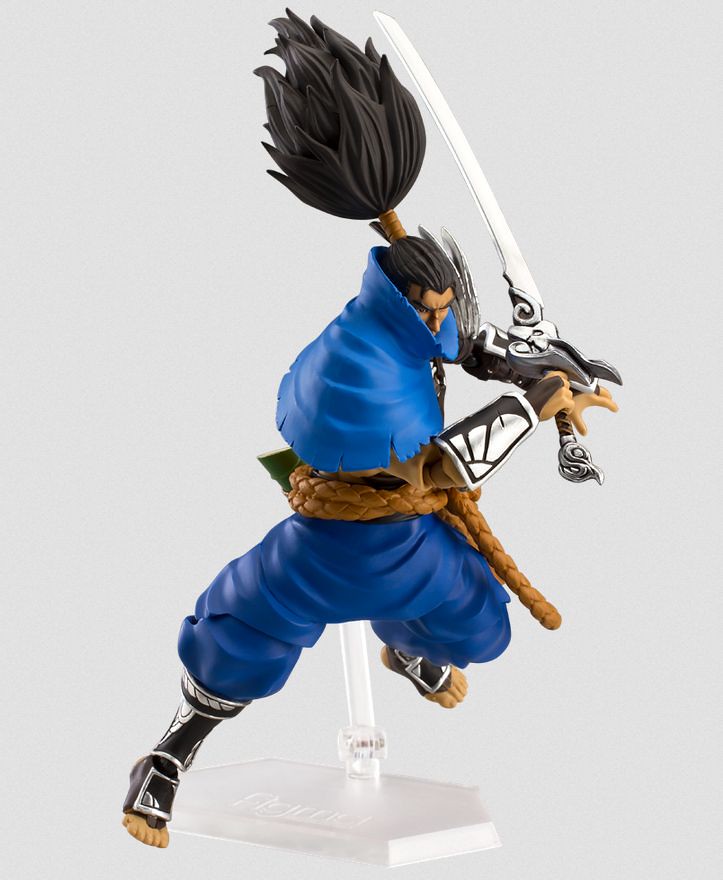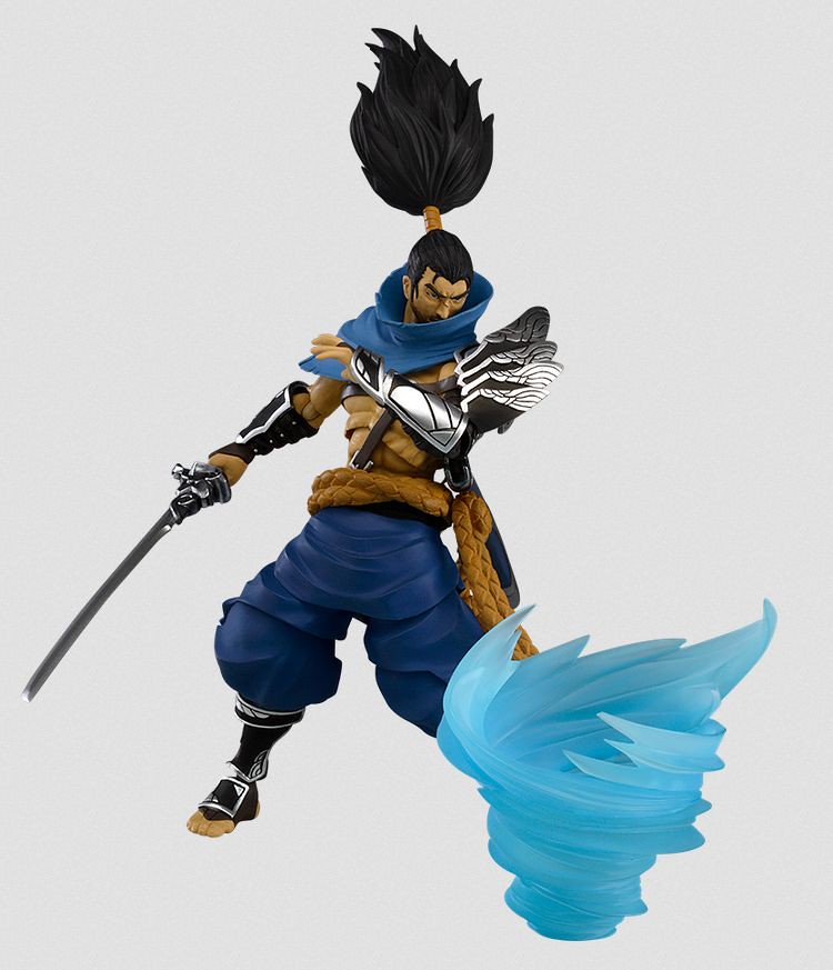 超人氣線上遊戲《英雄聯盟》這次由日Max Factory玩具公司的Figma可動系列將推出其玩家使用的放逐浪人「犽宿」YASUO,作品當然附有使出「鋼鐵暴雪」招式的狂暴龍捲風wind tornado特效配件,還有笛子(flute)與武器劍等等的配件都可以讓犽宿拿在手上,展現出遊戲裡面所呈現的畫面等等。
