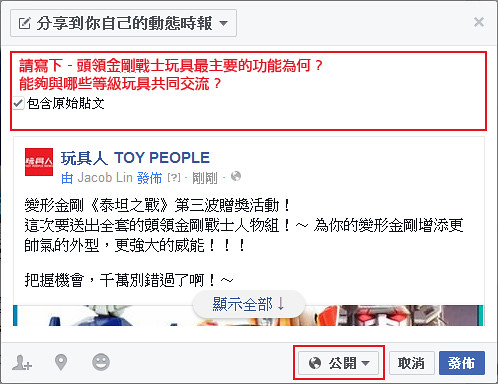 2. 並且轉貼至你的塗鴉牆寫下“ 頭領金剛戰士玩具最主要的功能為何? 能夠與哪些等級玩具共同交流?”。(權限記得要設定成公開,不然小編無法檢查你是否貼文,那就無法中獎嘍~)