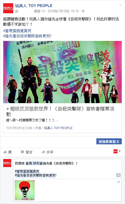 2. 到「玩具人」Facebook 的《自殺突擊隊》首映會贈票活動上傳你製作的圖片,並留言寫下“我想與○○○搶先看《自殺突擊隊》! #當壞蛋感覺真爽 #搶先看自殺突擊隊首映更爽!”。(只要寫下"@"符號並加上朋友的FB 名字即可TAG)
