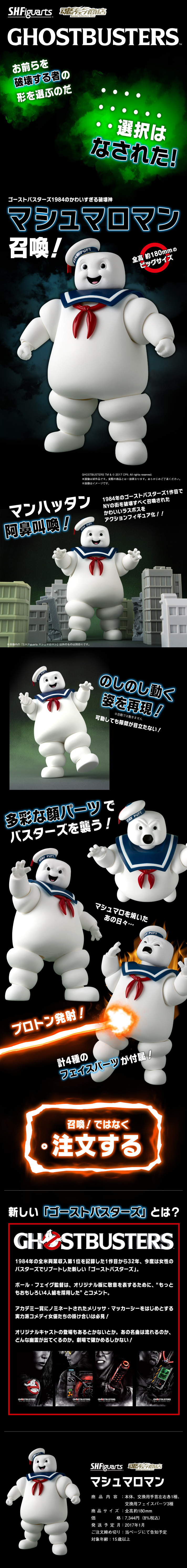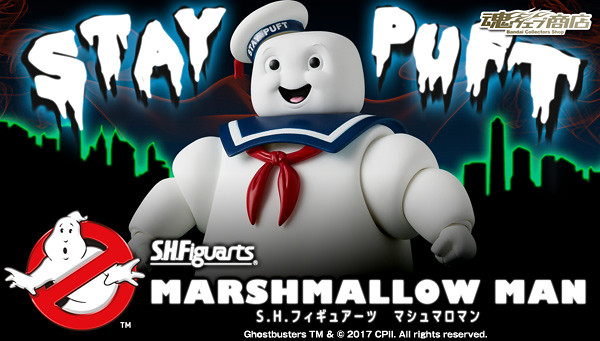 2016年8月9日新增官方宣傳圖片與販售相關資訊,作品附有三種不同表情的頭部配件可以替換,忠實表現電影裡面出現的情緒反應,還有交換用手首左右各1種,有張開手掌和握拳等等的配件,這次也以S.H.Figuarts這個系列裡面算是比較大的"18公分"高的尺寸來呈現,宣傳照當中也特別將「魂OPTION ACT BUILDING」的建築物放在棉花糖寶寶的周圍,營造出經典的劇中場景,預計將在魂web線上商店於2016年8月10日接受訂購,喜愛《魔鬼剋星》系列作的玩具人千萬別錯過了啊!!