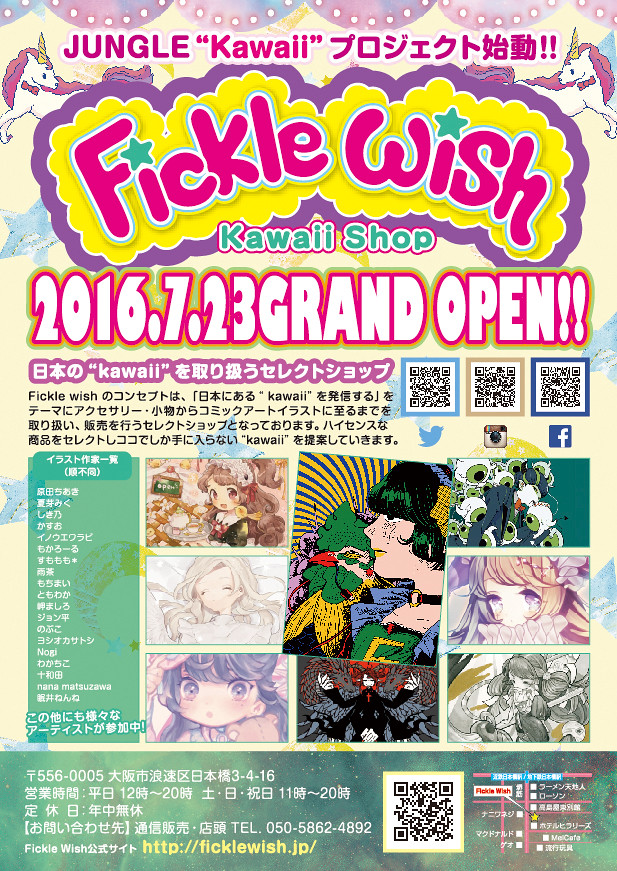隨著2016 年07 月01 日於美國洛杉磯小東京開設「Fickle Wish」LA 店之後,「Fickle Wish」大阪店則將於07 月23 日開幕(同一天在心齋橋的OPA 期間限定店鋪也將開幕)。此外,之後在2016 年08 月06 日各位玩具人更能透過「Fickle Wish 線上購物平台」購買到夢幻小物。一般來說在日本,有關設計師原創小物、飾品、雜貨類型的商品都只有在Designer Festival 會場限定販賣,然而這類型的活動一年只有幾次,所以若是無法前往會場就變得非常可惜。