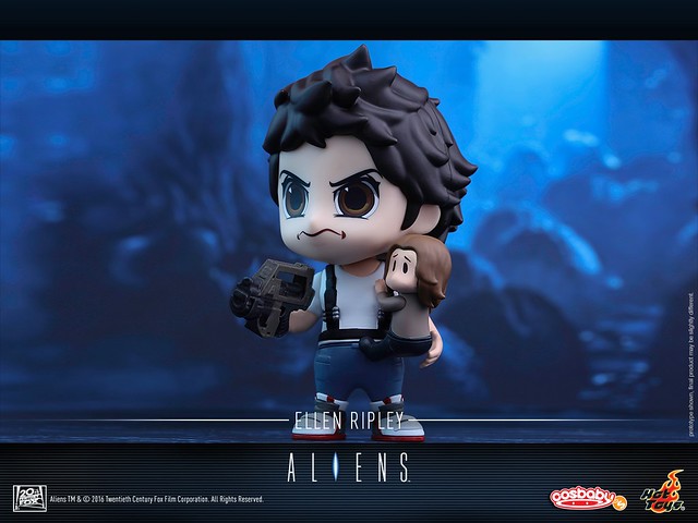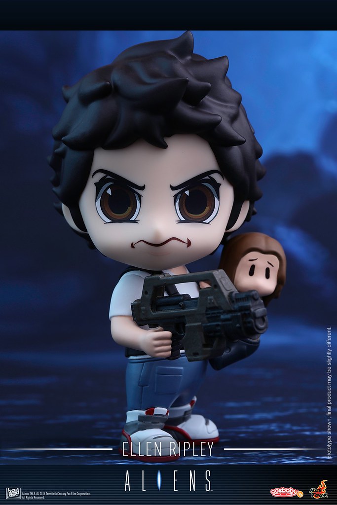 在電影異形2(Aliens)上映滿三十周年的同時,許多玩具品牌都紛紛推出一系列相關的玩具作品,而知名玩具品牌Hot Toys 公司將在旗下Q 版「Cosbaby」系列推出經典電影「異形2」中艾倫.雷普莉(Ellen Ripley)左手抱著小女孩Newt、右手拿著M41A 脈衝步槍的經典造型。