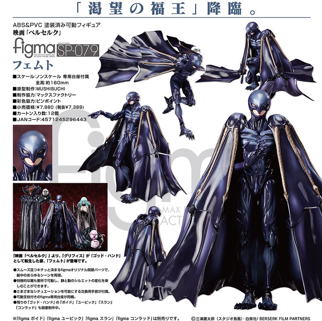之前figma系列已經推出過「鷹之團團長 古力菲斯」的可動作品了,這次將以映畫版本來推出劇中成為魔界第五人的特殊造型 - 費蒙特,全身上下深黑、藍暗色又有些光澤感的塗裝也完整再現,連身上的披風都像是有機生物一樣融入整體造型,披風上面也有多處可動關節的配置,和全身都使用figma的可動關節讓你可以輕易調整故事中所出現動作及姿勢等等的畫面。