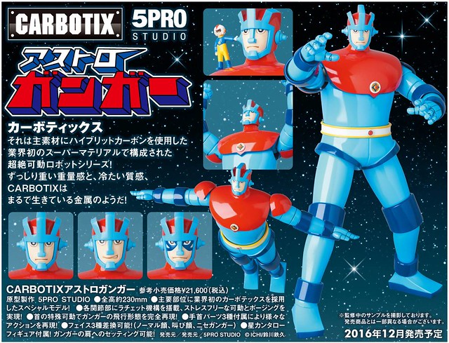 出現的比《無敵鐵金剛》マジンガーZ還要早,巨大機械人動畫的先驅者『鐵甲飛天俠』アストロガンガー(名稱暫譯),這次將由5PRO STUDIO韓國廠商推出其「CARBOTIX」合金材質系列的立體可動作品,可以替換特殊「飛行型態」的手首配件來呈現劇中的經典模樣,還有約三種不同表情配件可以更換表現出故事裡面機械人不同的情緒等等,還有駕駛者「貫太郎」也以配件收錄其中,喜歡合金系列或是早期動畫作品的玩具人可以參考一下歐!