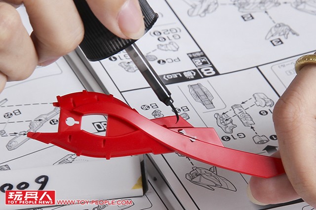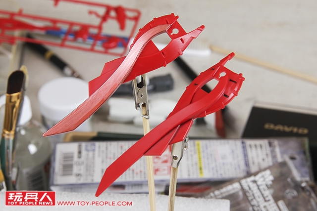 ▼ 潔哥:今天目標是要用金屬紅將機翼的部位塗裝,鋼彈麥克筆頭的形狀好像有點不好掌控,有些細部沒辦法塗到喔,這該怎麼辦呢!?