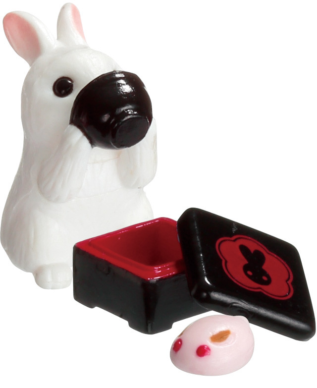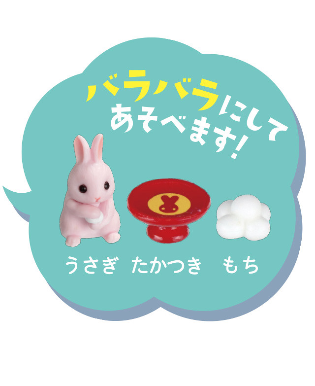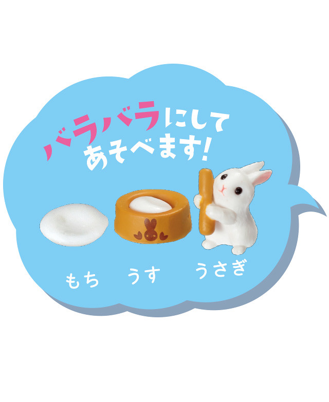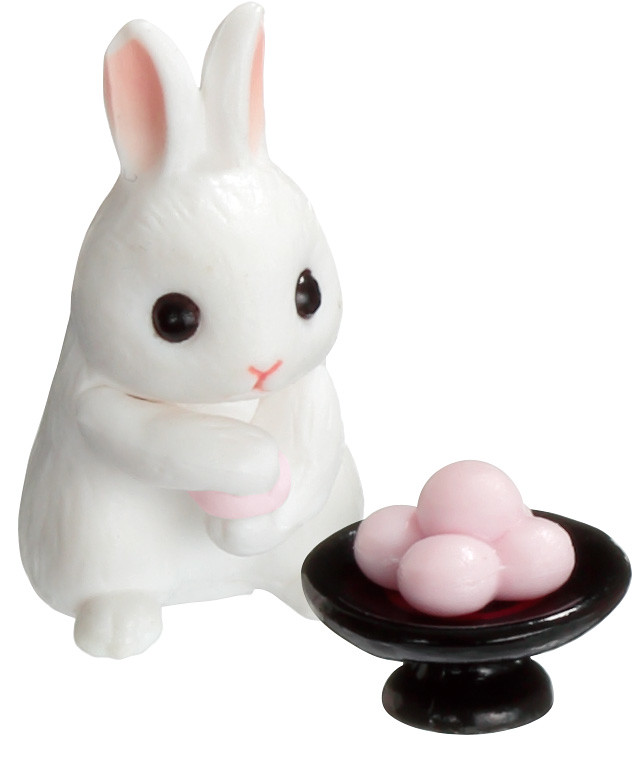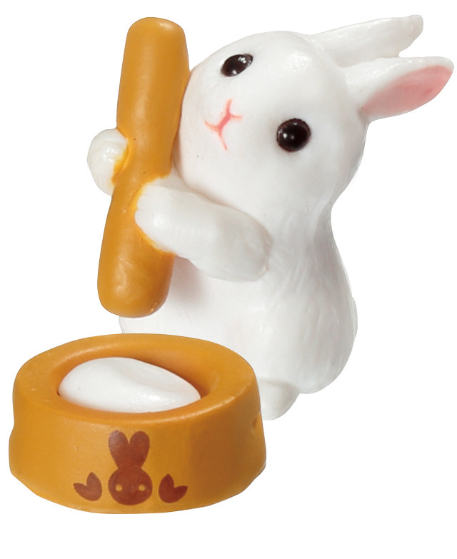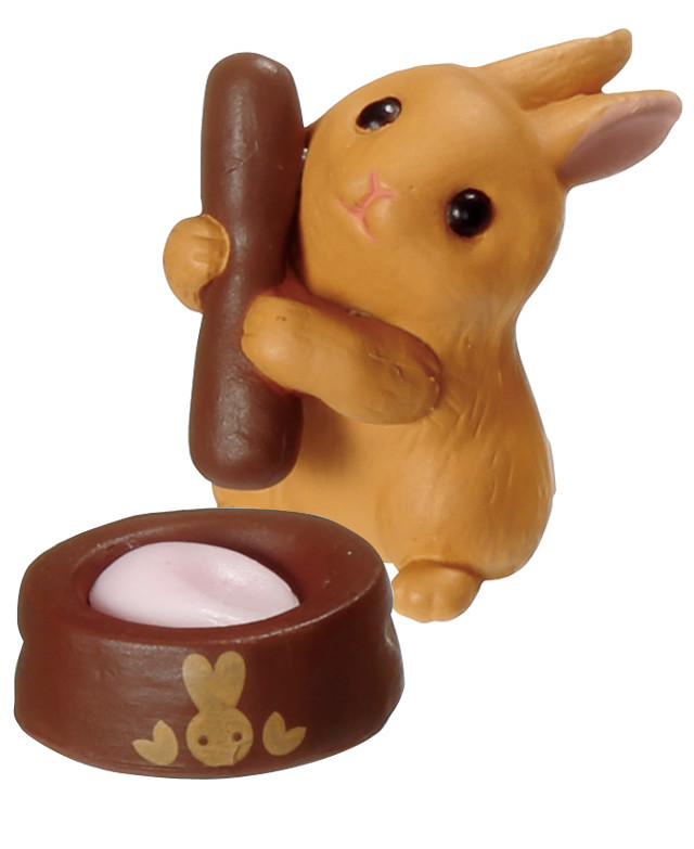 「搗麻糬兔子」將圓滾滾的可愛兔子與研杵研缽等器具結合,不但外型可愛,器具以轉蛋的品質來說非常精緻。兔子們分工合作用心地搗著麻糬,充滿愛心的麻糬不論是做成「月見糰子」或煮成「麻糬湯」一定都非常美味喔!(後面那隻你不要偷吃啊)「搗麻糬兔子」共有6種款式,分別為: