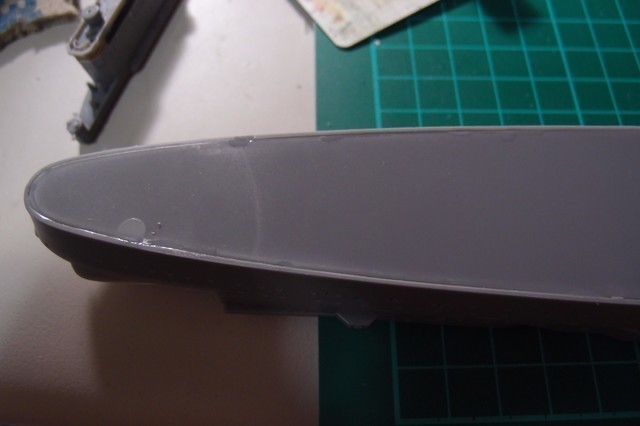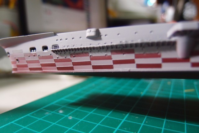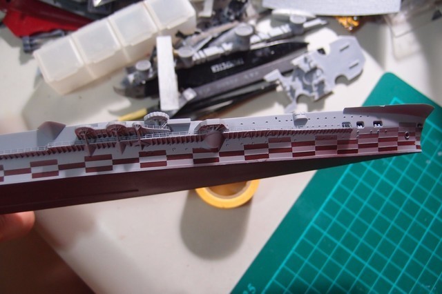 之後上方則先用固定大小的遮蓋膠帶貼出互相交錯的紋路,這是為了要製作出船身鋼板拼接的效果,貼完一層後噴上厚一點的底漆補土,再除去膠帶就能呈現出照片中的效果,而紅色的地方也不急著先用薄噴的補土遮掉,保留下來之後會有用處