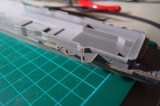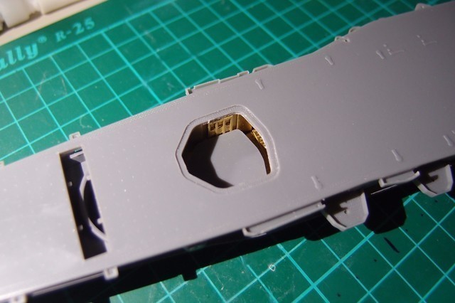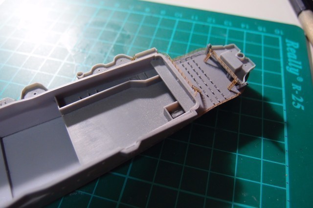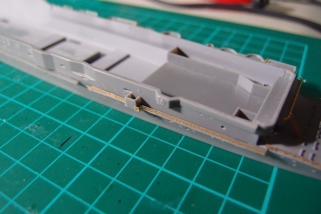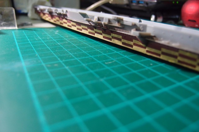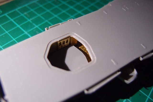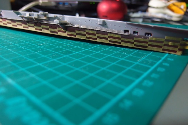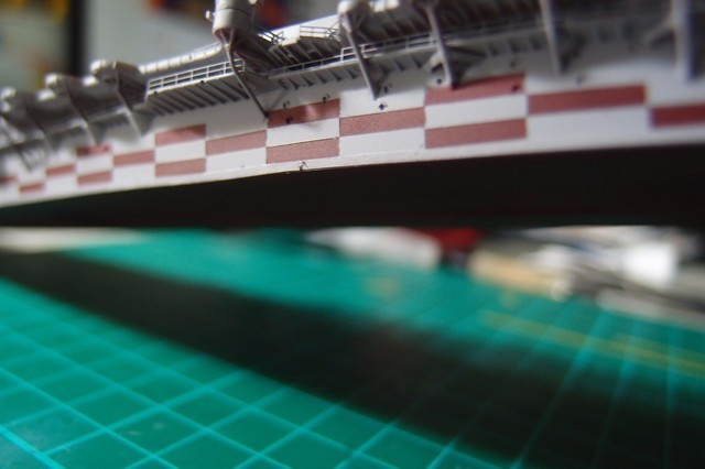 像照片中船身外側的走道我個人是習慣先從下方開始組裝,等到連蝕刻片都黏完之後才會組裝上面一層