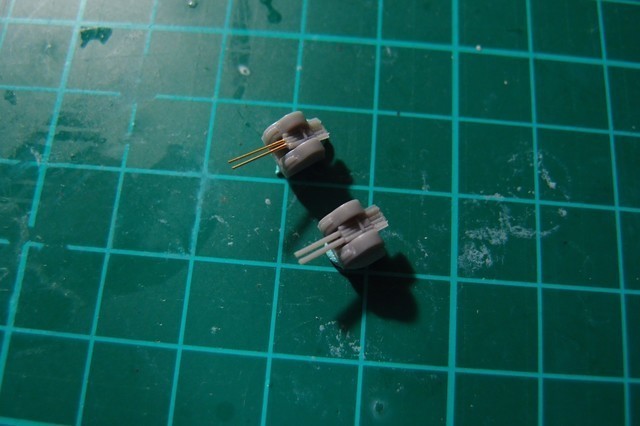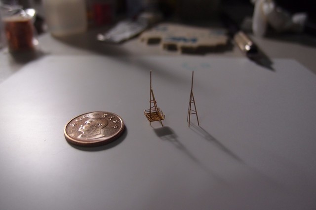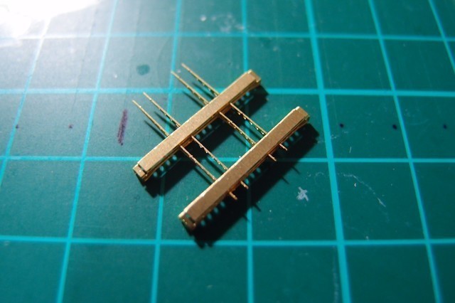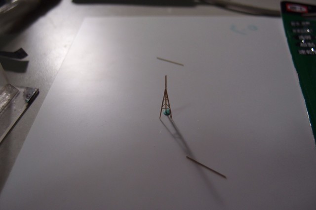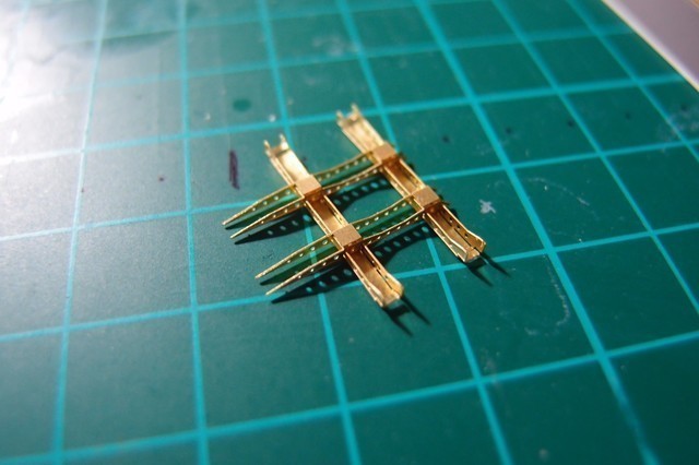 再來是改造的部分,如各位所見雖然蝕刻片已經將上述支架細緻的表現出來,但在強度上並不是很足夠,所以我改用0.3MM的銅棒和0.1MM的漆包線將支架重新製作,圖二左邊是自製的支架