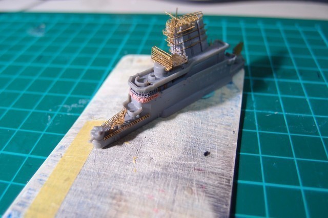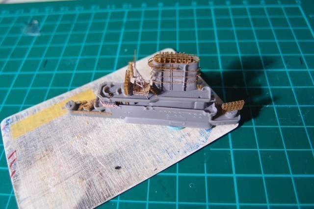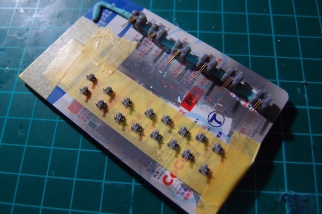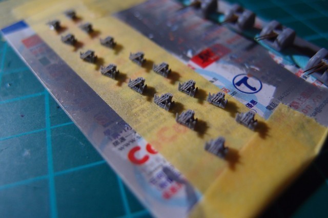 另外零件考量到組裝後要噴漆分掃可能會比較麻煩所以我都是先黏在塑膠板上等一次處理完噴漆後再裝回空母上