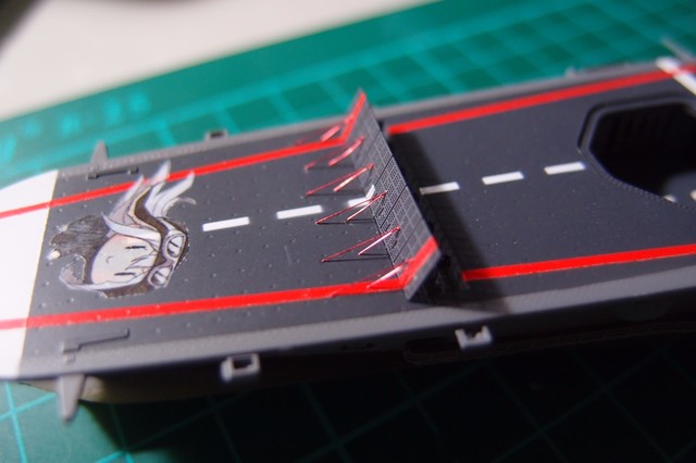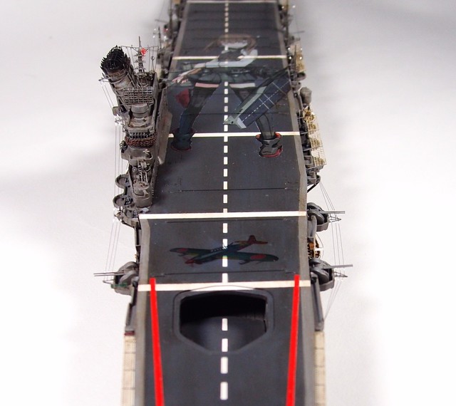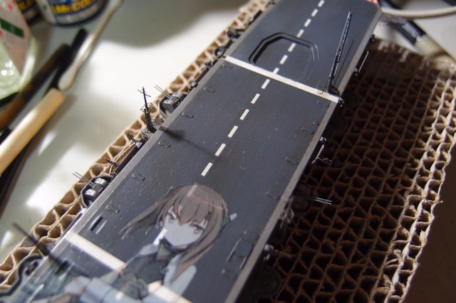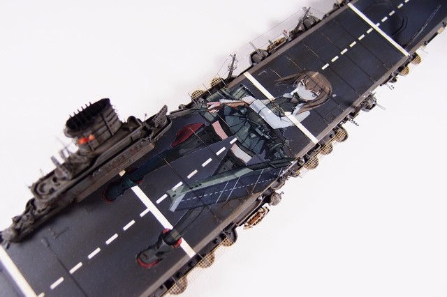 這架空母製作的風格上一樣是做成有艦隊收藏遊戲人物圖案痛貼的風格,另外由於希望至少在模型上能夠改寫這架空母的命運,所以我是以假設它能存活到終戰時的情況來製作