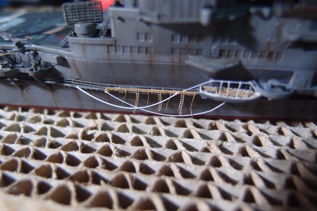 一些細節包括調救生艇的繩索和系留杆也要配合整體的色調施以舊化