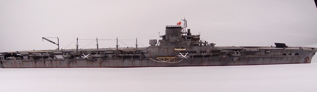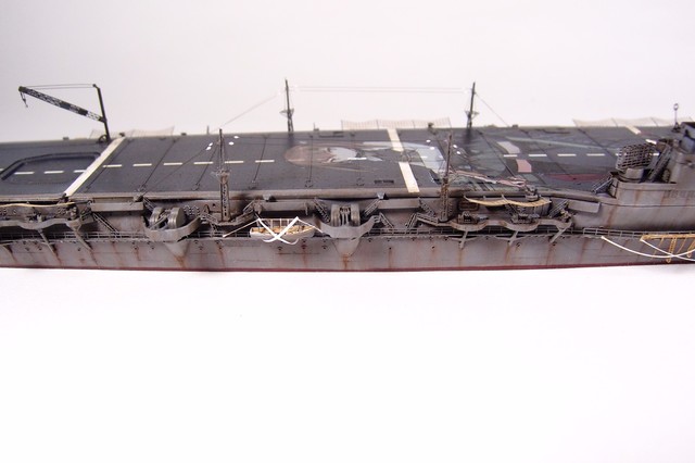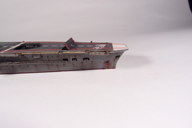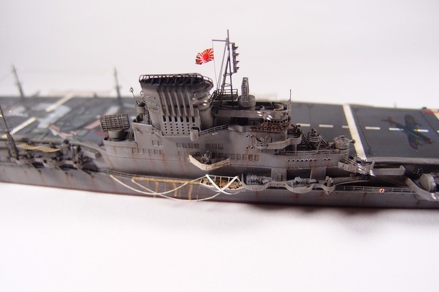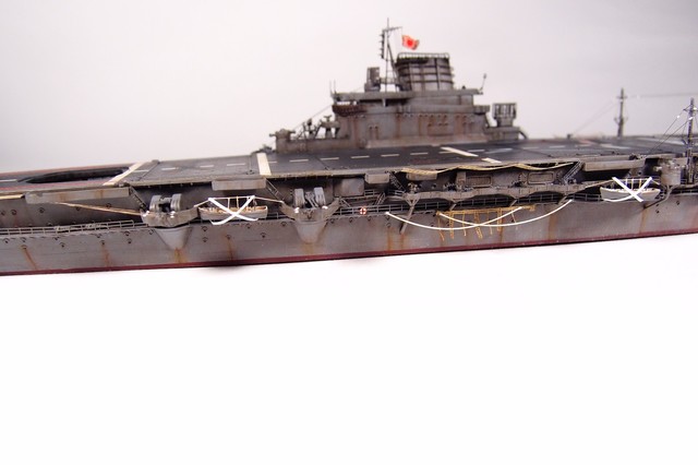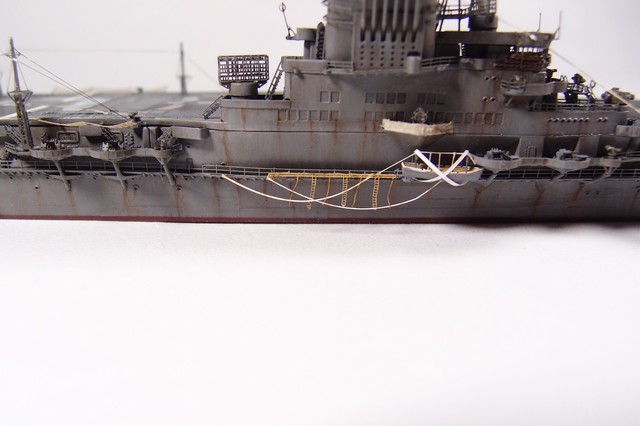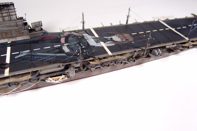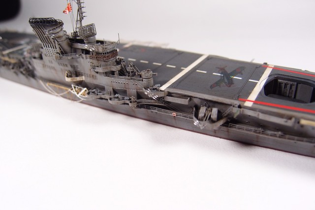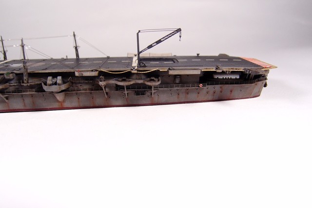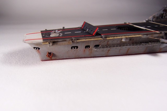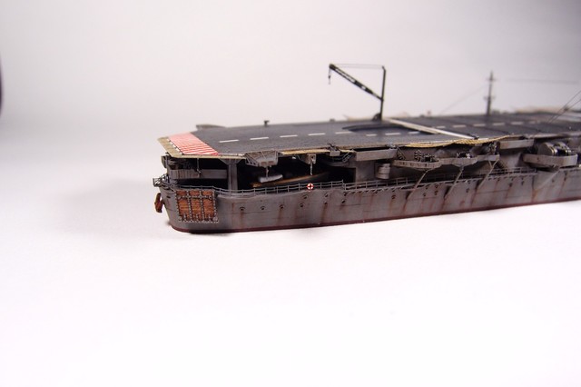 由於前面也說過這次的情況是假設大鳳有留存到終戰時的情況,所以船身必定是充滿鏽蝕與歲月的痕跡,因此舊化方面是將整體船身先WASH過,用溶劑擦乾之後因為顏色過深會導致之後的銹色不好處理,所以有再用淺灰色的油畫顏料調整整體色調,最後則是加上銹蝕的水痕