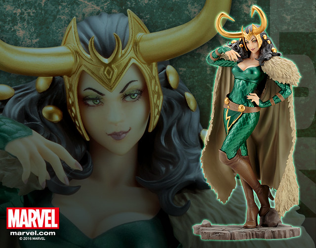 日本知名品牌壽屋(KOTOBUKIYA)繼推出了「雷神索爾小姐」(Female Thor)的雕像作品之後,又將繼續攜手知名插畫家山下俊也,在旗下「美少女系列」(Marvel Bishoujo)推出最新1/7 比例「洛基小姐」(Lady Loki)全身雕像作品。