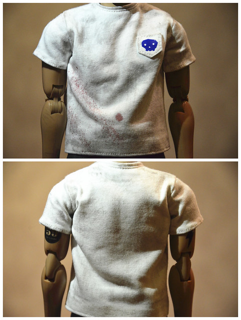 ▲T恤,白色搭配左胸口袋的極簡設計,也是如今潮人比較喜歡的穿著,左胸口袋的小骷髏,雖小,但是點綴的恰到好處,潮流氣息十足。衣服上有進行做舊塗裝,濺血的效果,好評。