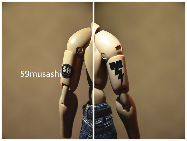 ▲紋身,左臂印有59musashi的字樣,右臂印有一個大M和閃電的標誌。紋身的位置感覺選的很好,比較低調,正面看不出,拿到背面發現細節的驚喜,估計只有親自把玩的人才能夠感受到。