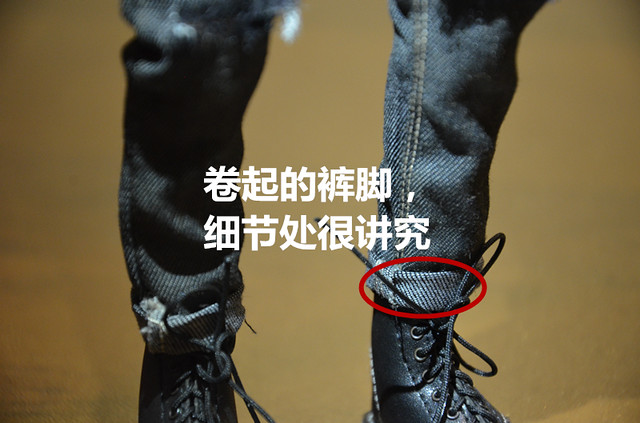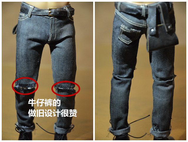 ▲牛仔褲的設計也是亮點,細節處理很講究,首先是做舊,膝蓋處的重度做舊,也體現了廢墟設計的大膽,而roll褲腳也是潮人必備之一,這一些,廢墟都一一考慮到。但是魚和熊掌不可兼得,凸顯體型以及潮流氣息的同時,褲子偏緊,影響了下半身一定的可動。這點如果可以用3A做牛仔褲用的彈性的面料,效果可能會更好。