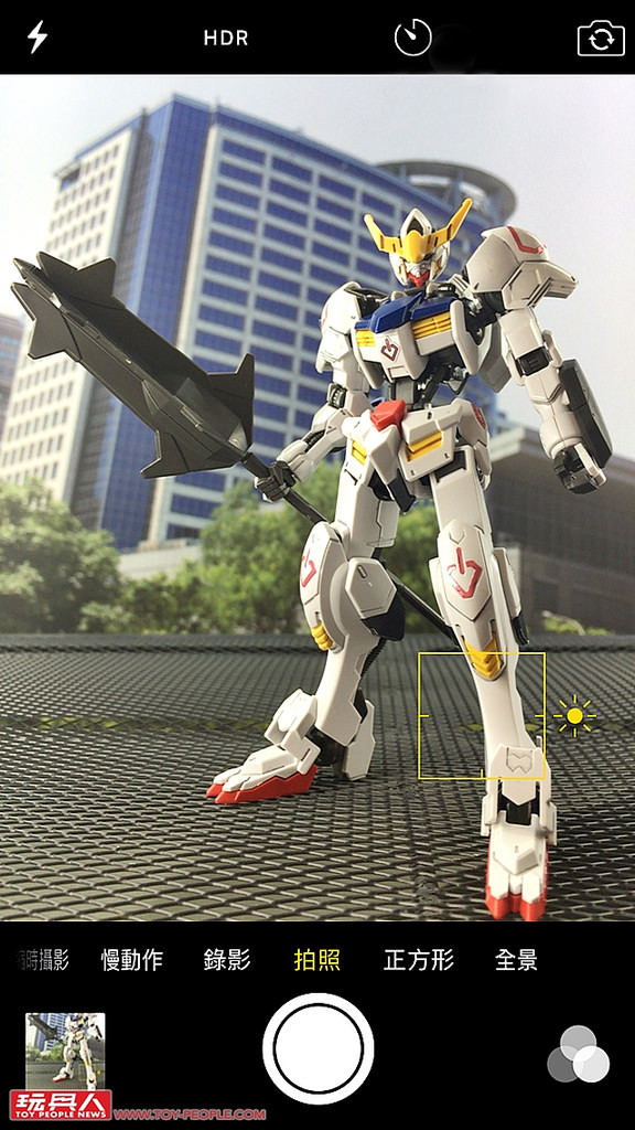 手機的鏡頭大部分多為廣角鏡,拍攝角度上鏡頭也需偏低角度,一是讓鋼彈較壯觀,二是可以讓模型擬真度提高,讓比例更像真的。