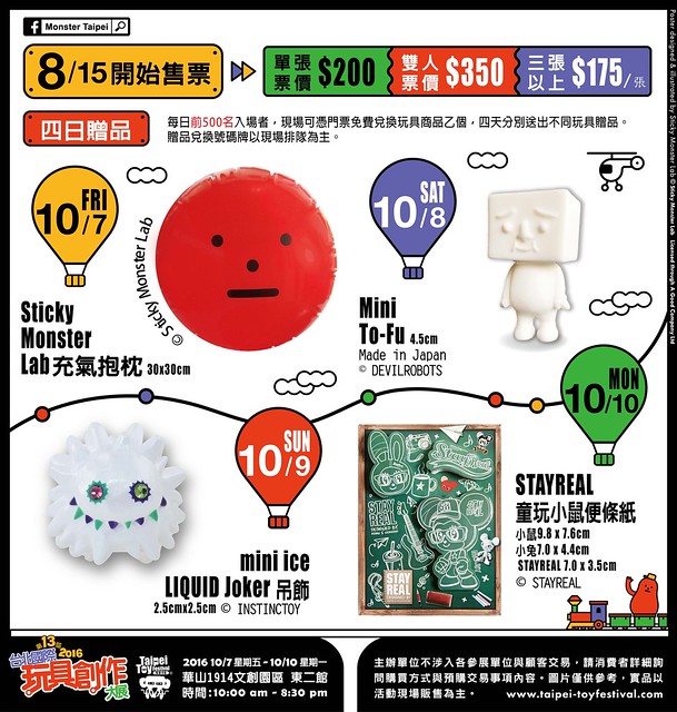 ★每日前500名入場者,憑門票免費兌換玩具贈品乙個,四天分別送出不同玩具贈品。(贈品兌換號碼牌以現場排隊為主。)