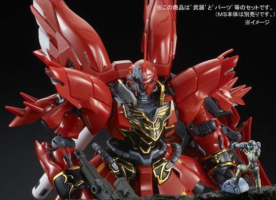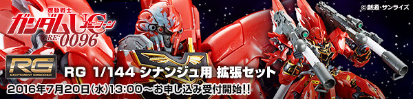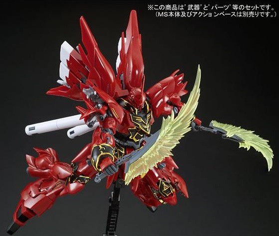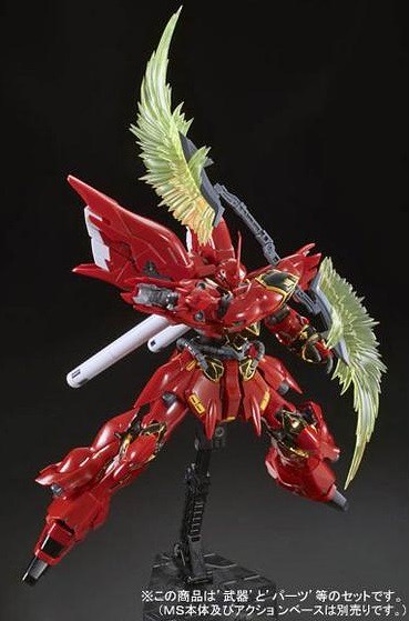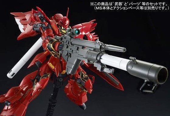 在《機動戰士鋼彈UC》作品所登場令人印象深刻的「新安州」シナンジュ機體,此次日Bandai萬代玩具公司的RG版本將推出其1/144 比例尺寸的"擴充套組"シナンジュ用 拡張セット,內容物將有約五種豐富配件,武器火箭砲X2、光束斧用特效配件X2,和一個戰損版本的頭部及達格薩中校人偶,還有手掌配件(握拳狀態)左右各1等等。