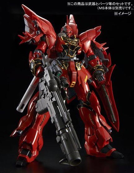 屬於新安州專用大型實體武器的「火箭砲」,使用了比照RG風格所設計結構的全新開模零件來呈現,並且搭載了伸縮、合體的機構,可組裝在光束步槍或護盾上,再現故事劇中後段同時使用2個火箭砲的經典場面,當然此擴充套件也附屬有2個火箭砲!另外在電視版本片頭動畫中新安州將光束斧連結為光束薙刀加以旋轉揮舞的畫面,此次的「光束斧用特效配件」當然重現其揮舞路徑的散射狀光束刃,造型更能充分地表現出旋轉揮舞光束薙刀時候的動態感覺。