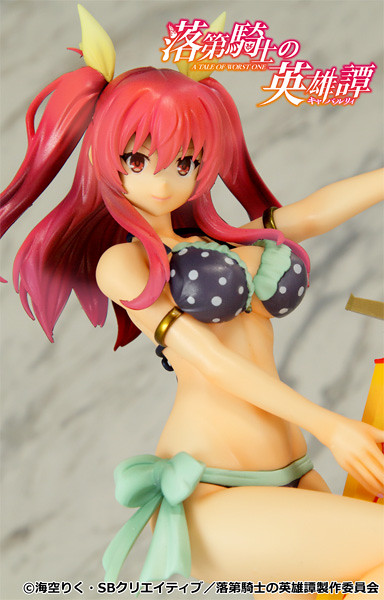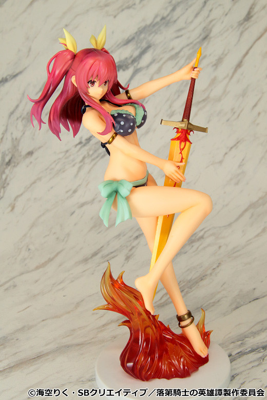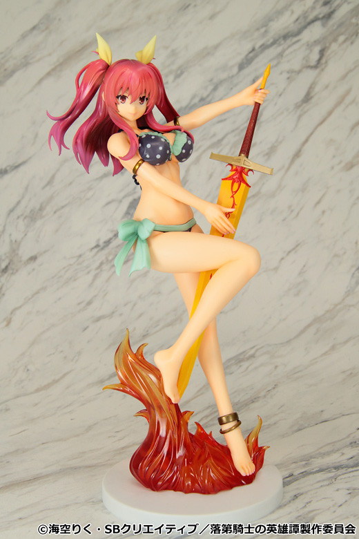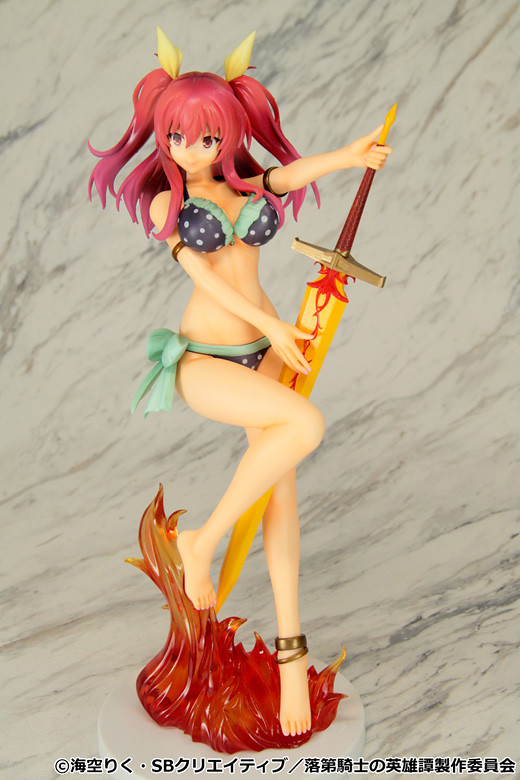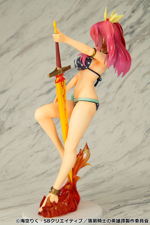 這款「史黛菈·法米利昂」以劇中十分清涼的泳裝造型為基礎製作,搭配上裝飾著可愛花色的比基尼,充分展現她驚人的好身材。手中握著的是她的愛劍,長約20公分的固有靈裝「妃龍罪劍(Lævateinn)」,這把劍能展開成超過100公尺的巨大光劍,擁有焚毀世間萬物的破壞力!地臺也為呼應她的能力,使用了透明零件製作出火焰的造型。