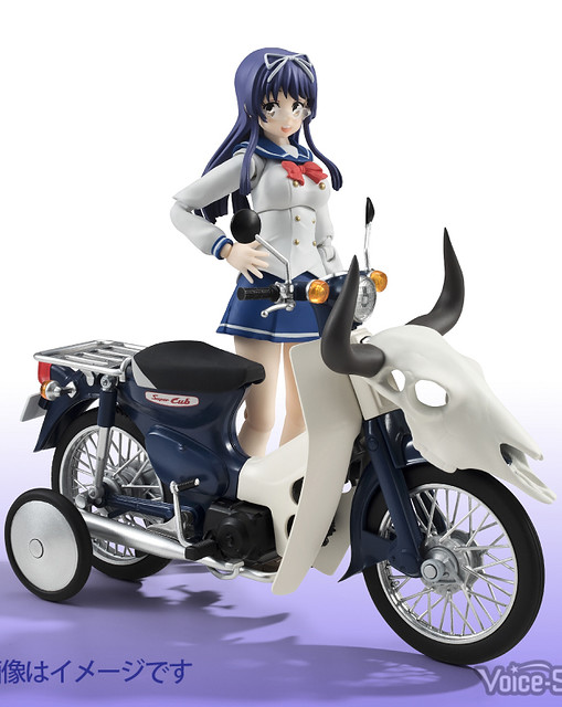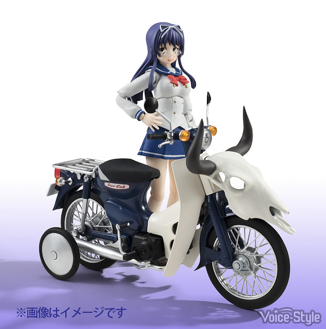 日BANDAI萬代玩具公司的S.H. Figuarts可動系列以人氣動漫《爆音少女!!》為主題,將推出「鈴乃木凜&GSX 400S KATANA」和「佐倉羽音(製服版本)&CB400 SUPER FOUR」還有「天野恩紗穿(高校製服)&SEROW225W」等等三款立體作品,近日又曝光了「三之輪聖+補助輪SUPERCUB(牛的頭蓋骨付屬)」三ノ輪聖+補助輪つきスーパーカブ(牛の頭蓋骨付き)(名稱暫譯)。