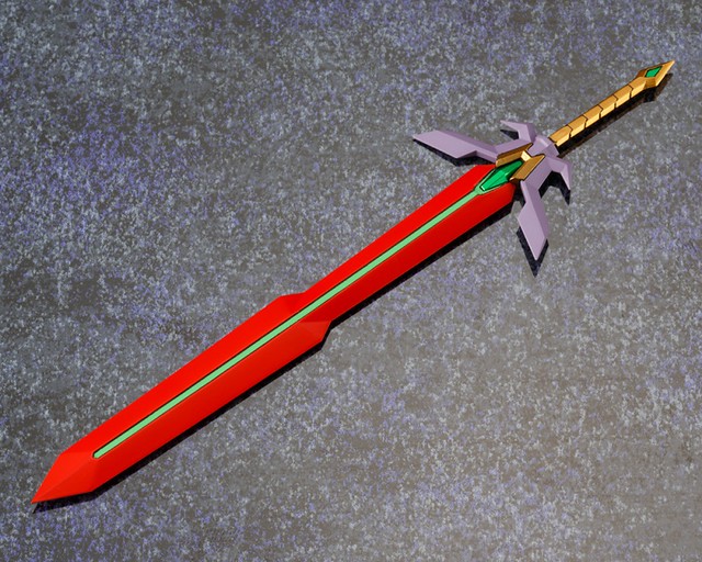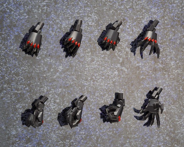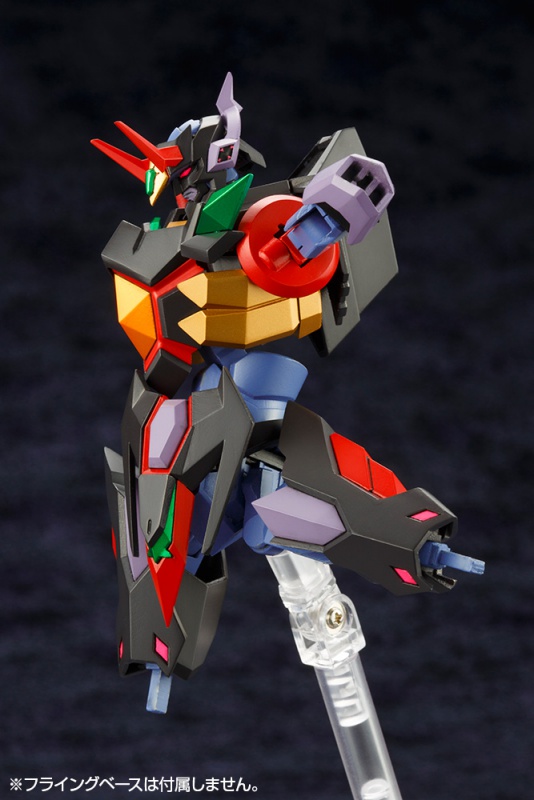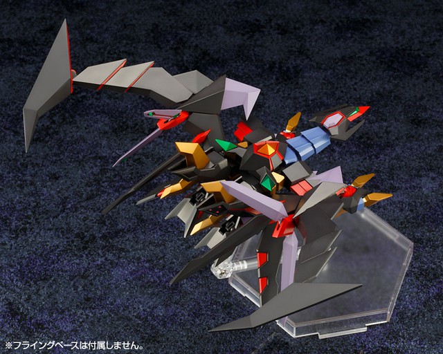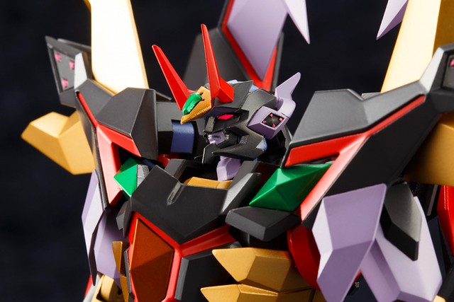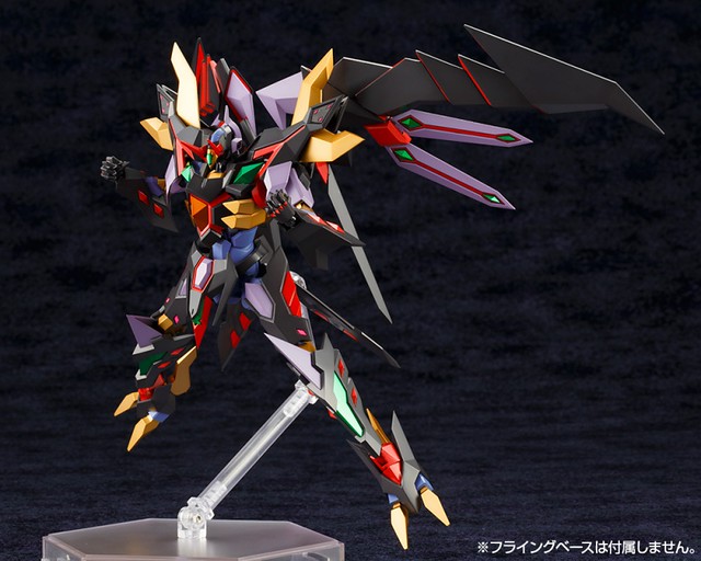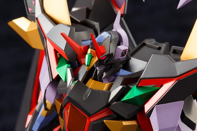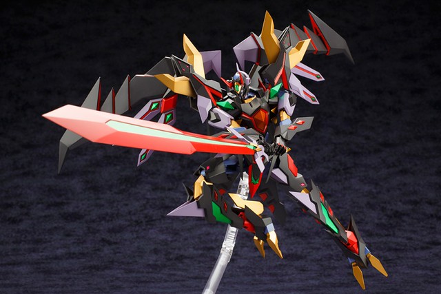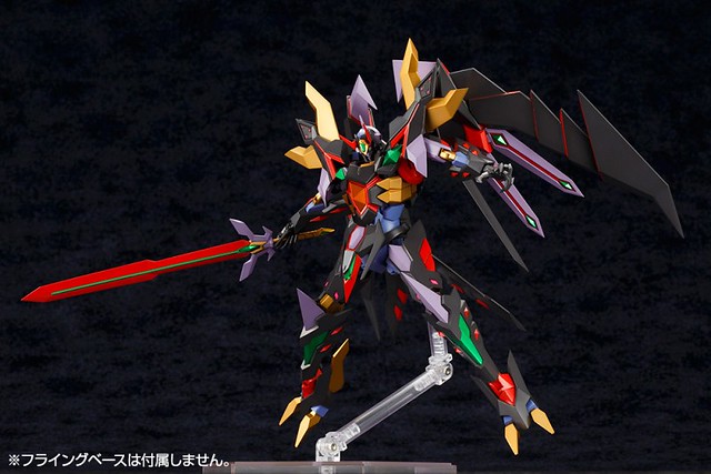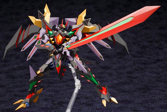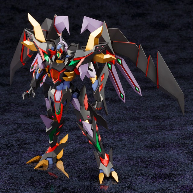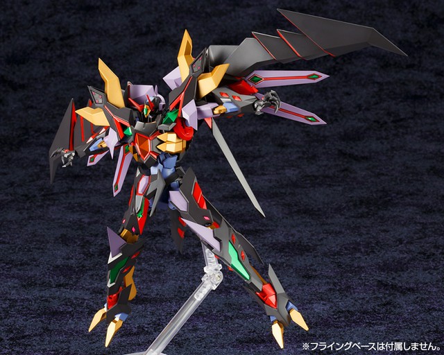 這款「狩狼牙·罪」組裝模型交由負責機體設計的大張正己完全監修,造型可說是完全沒有問題,非常帥氣。配件附上了左右各四種的PVC造型手掌與使用「インテグラル・ディスキャリバー」招式時的魔王劍,透過替換零件的方式就能轉換成變形後的「黑鳥型態」,為了做到雙手持劍在肩膀設置了拉出式關節,可以完全重現魄力滿點的大張風格「勇者架勢」!