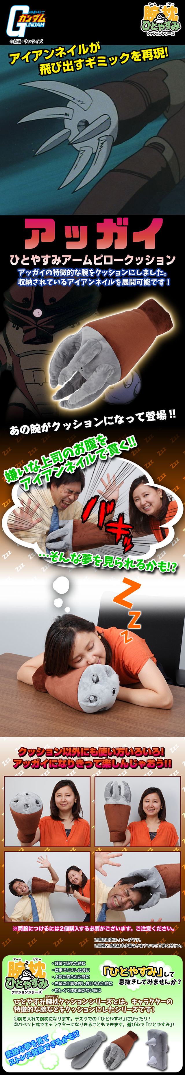 「小憩腕枕」系列將角色們極具特色的腕部造型融入生活中,設計成腕枕的形式讓你在休息中也能感受到角色的魅力。第一彈商品推出了三部經典作品中腕部讓人印象深刻的角色,分別為:《超人力霸王》中的宇宙忍者巴爾坦星人、《機動戰士鋼彈》中的水陸兩用MS亞凱以及《金肉人》中惡魔六騎士之一的破銅爛鐵人。