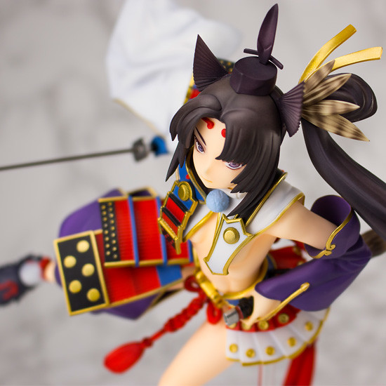 PULCHRA的「Rider/牛若丸」如同遊戲中的插畫般華麗,服裝各處繁雜的細節都處理得很精緻,但她的五官則不像遊戲中稚嫩,而是更加成熟更帶殺氣。人物動作則展示了牛若丸身輕如燕的天狗身法,不過這個動作很容易讓卡榫斷在鞋底,擺設時一定要喬好支架位置喔!