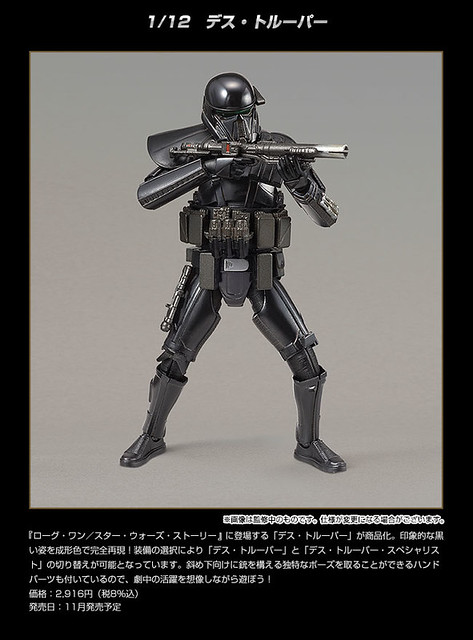 日Bandai萬代玩具公司的組裝模型事業部門以《星際大戰》電影為題材,已經推出多款劇中飛行載具或是角色人物等等,像是「黑武士-達斯‧維德」、「帝國風暴兵」與「C-3PO」和「法斯馬隊長」等等的角色人物,這次將推出還未上映《星際大戰外傳:俠盜一號》裡面的死亡兵 DEATH TROOPER(名稱暫譯)。