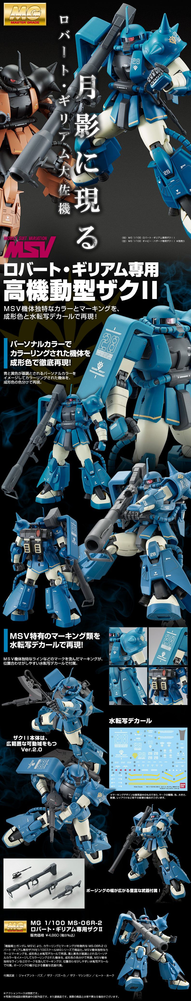 《機動戰士 鋼彈》系列動畫裡面吉翁軍經典的「薩克II」ザクII機體,這次MG組裝模型系列將推出"羅伯特·吉列姆大佐"所專用(ロバート・ギリアム/Robert Gilliam 専用)版本的高機動型薩克II,此次以特別藍色塗裝呈現吉翁軍中有「擊墬王」稱號的經典機體。