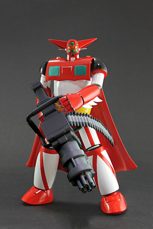 背後披風也加大並添加有皺褶波紋的模樣,另外還增加有「蓋特機槍」ゲッターマシンガン的武器配件等等,Dynamite Action!可動系列以使用「磁石關節」技術,以金屬球體與磁鐵相連接而成的關節部位可以讓活動度更加提升,喜歡永井豪老師作品《蓋特機器人》的玩具人可以參考一下歐!